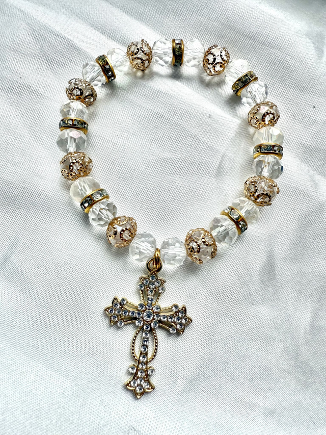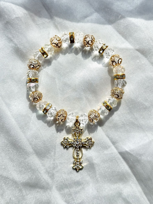 Le bracelet Dinah est un bijou de pureté, de dignité et de force intérieure. La croix sertie de pierres diamantées évoque la protection de Dieu. Les perles transparentes et les noeuds rappellent la justice et l’espoir que la foi peut raviver, même au cœur des épreuves.