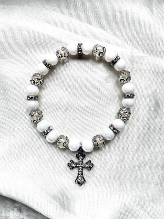Les perles blanches lumineuses de ce chapelet évoquent la pureté et la lumière céleste de l’ange Gabriel, le messager de Dieu (Luc 1:26-28). Il fut envoyé à Marie pour lui annoncer la naissance de Jésus, portant une parole de paix et d’espérance qui a changé l’histoire du salut. Le transparent symbolise la sainteté et la présence divine qui l’accompagne à chaque mission.