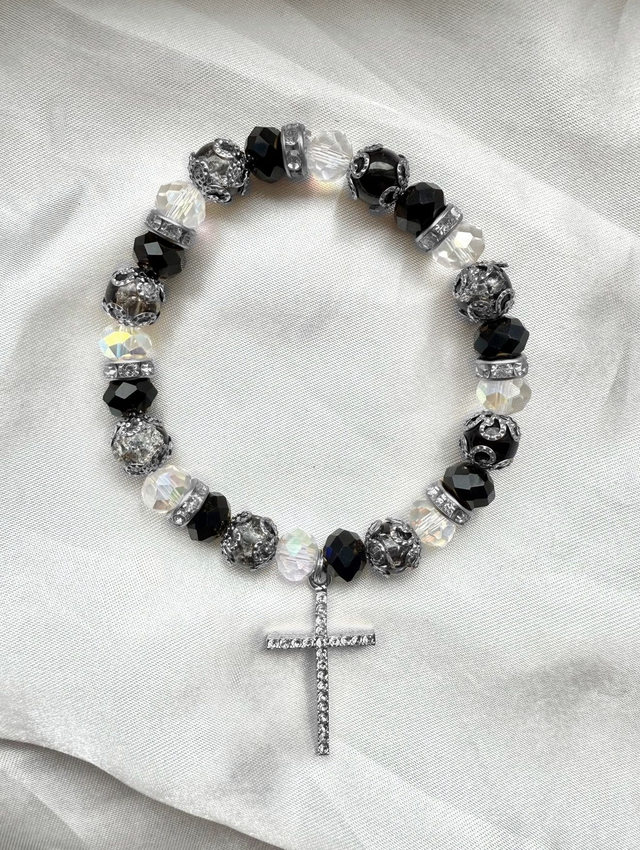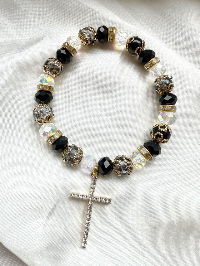 Le noir symbolise la force, le mystère et la profondeur spirituelle, les touches de doré représentent la lumière divine et la gloire céleste. Les perles holographiques, avec leurs reflets changeants, évoquent l’infini et la magnificence de la création de Dieu.