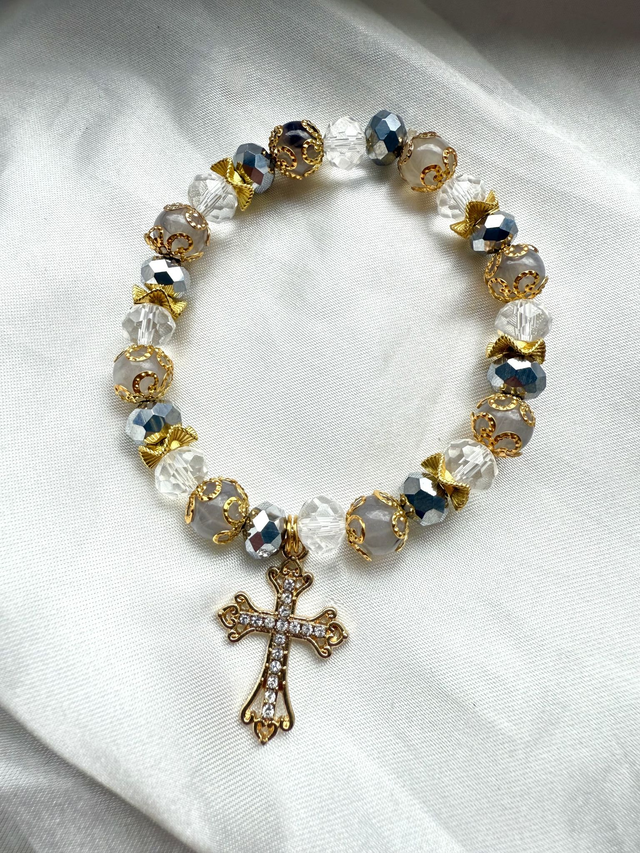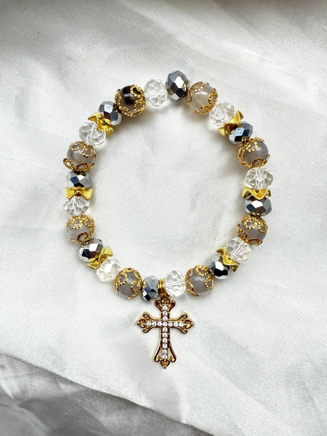 Le gris de ce bracelet évoque l’humilité, la sagesse et la simplicité, le doré symbolise la lumière divine, la gloire et la présence de Dieu.