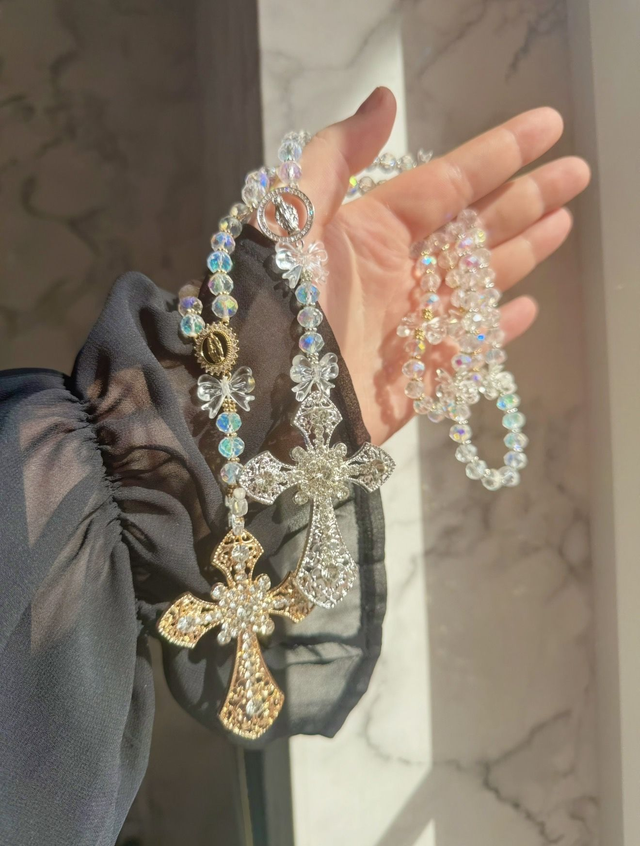 Le chapelet Dinah est un outil de prière de pureté, de dignité et de force intérieure. La croix sertie de pierres diamantées évoque la protection de Dieu. Les perles holographiques et les noeuds rappellent la justice et l’espoir que la foi peut raviver, même au cœur des épreuves.
