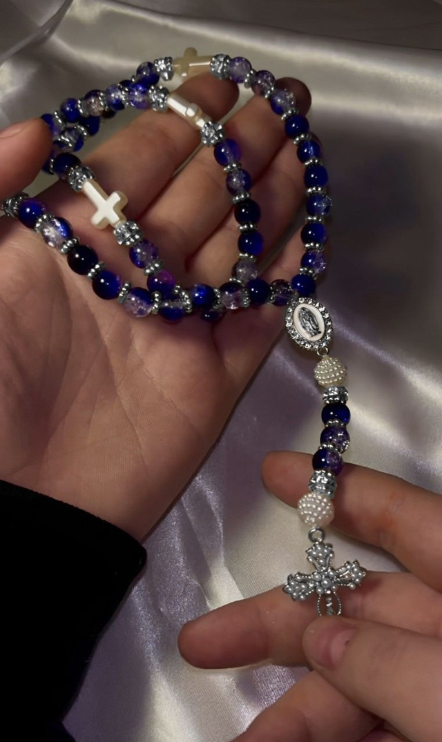 Le bleu azur de ce chapelet rappelle la foi profonde et la confiance en Dieu qui guide Eliora à travers les épreuves, évoquant le ciel infini et la protection divine. Le bleu marine symbolise la profondeur spirituelle et la constance de cette foi dans les moments difficiles. Le doré reflète la lumière et la gloire de Dieu qui éclaire son chemin, tandis que les perles blanches incarnent la pureté de l’âme et l’élévation spirituelle qui accompagne ceux qui suivent la volonté divine.