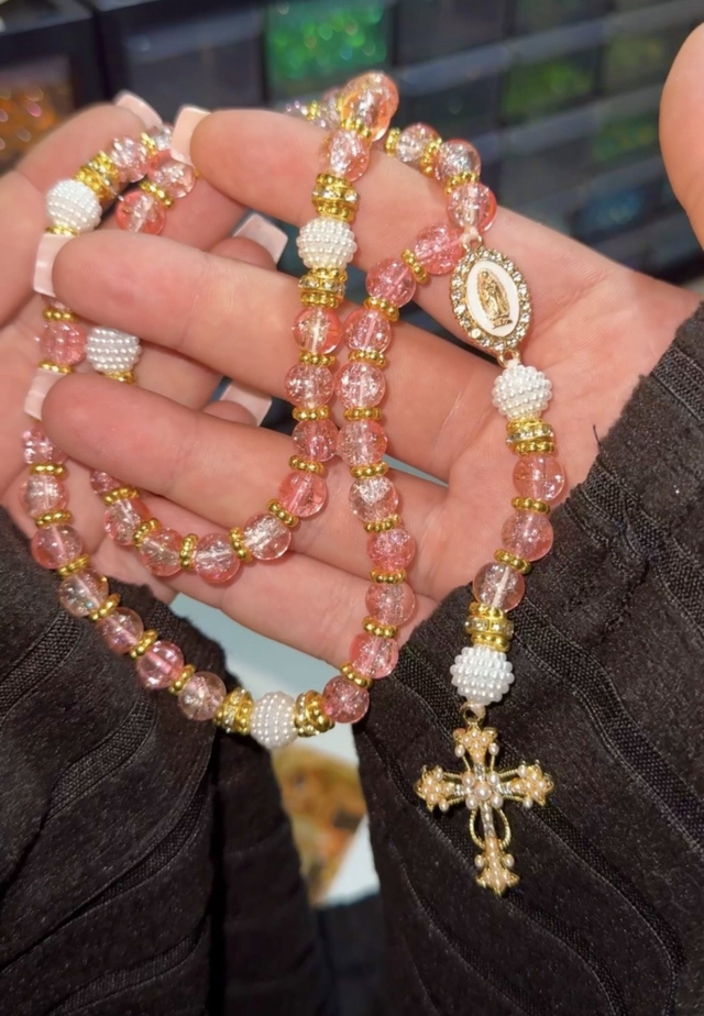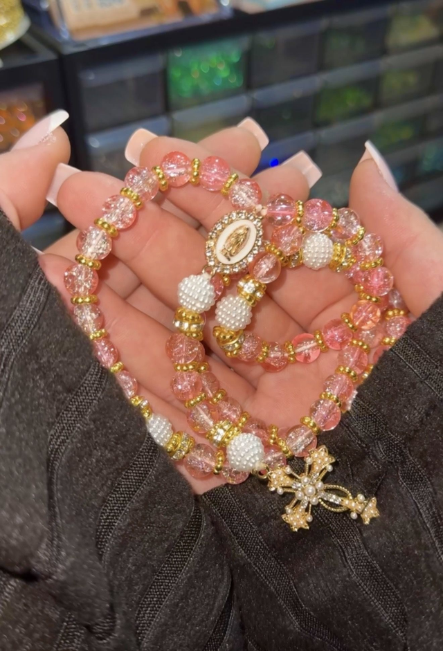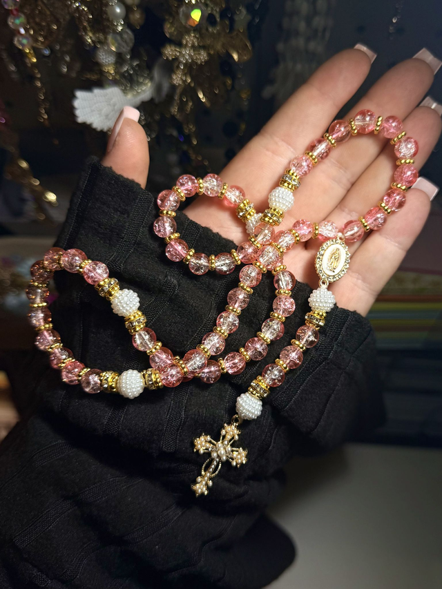 Les couleurs de ce chapelet racontent cette mission : le blanc représente sa pureté et sa confiance en Dieu, le rose son amour et sa compassion pour son peuple, et le doré la royauté et la faveur divine qui l’ont accompagnée. Comme une étoile guidée par Dieu, Esther montre que l’humilité peut devenir force et que la foi peut changer le destin d’une nation. 🌟