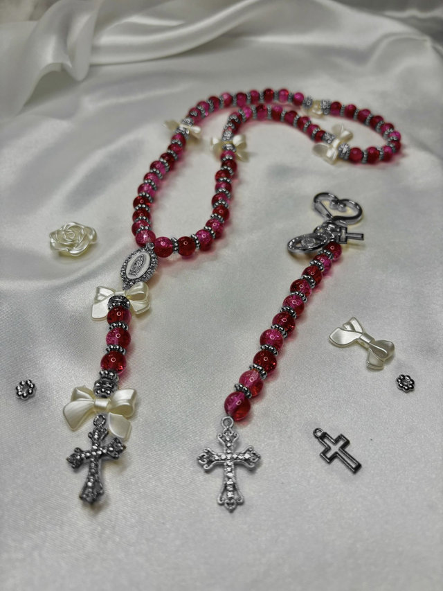 Le rose framboise foncé symbolise la chaleur, l’amour profond et la douceur divine et le doré/ l’argenté évoque la lumière céleste et la bénédiction divine. Ensemble, ces couleurs reflètent l’équilibre entre les épreuves et la grâce.