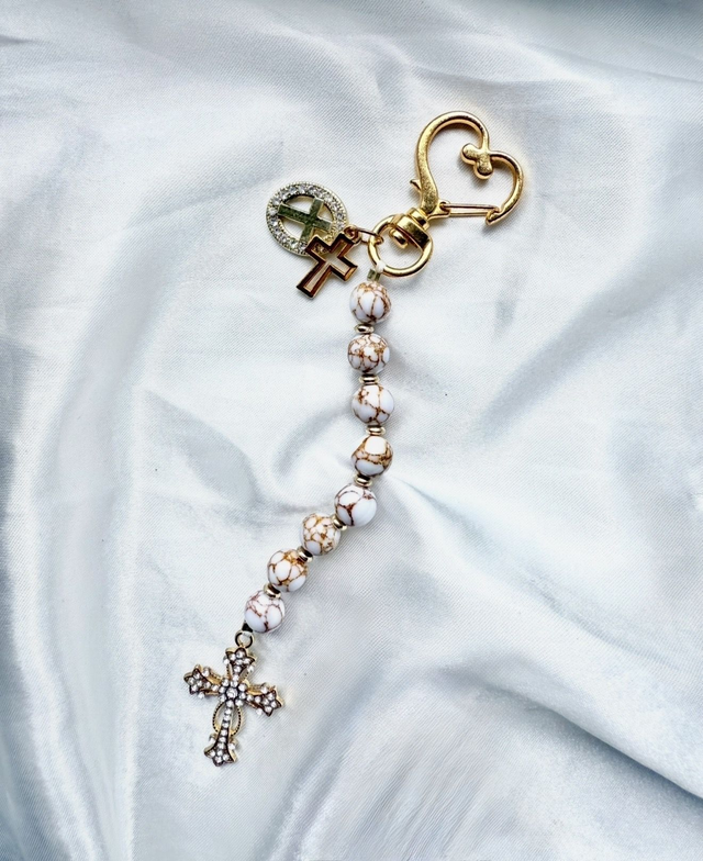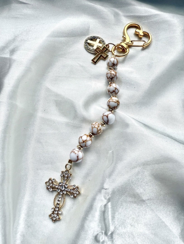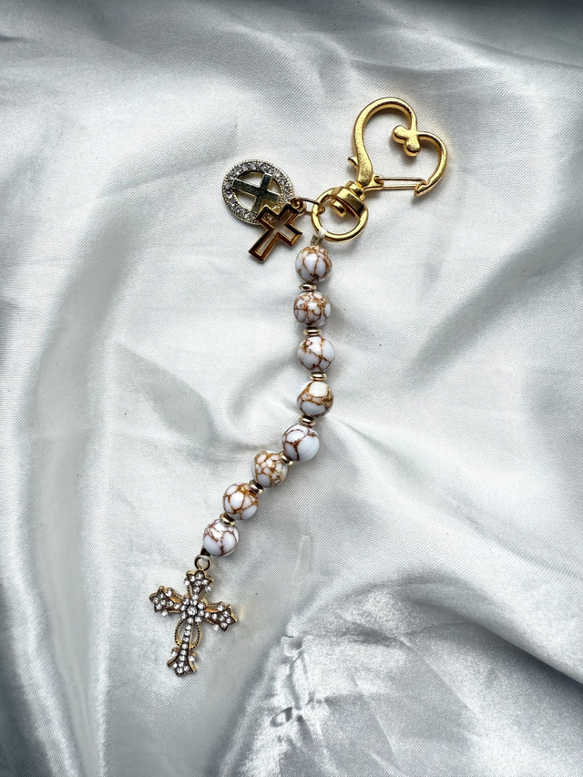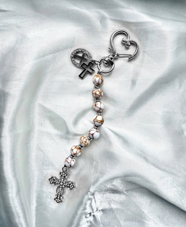 Les perles marbrées de blanc et d’or rappellent la sagesse ancienne, les contrastes de la vie, et la recherche d’équité.