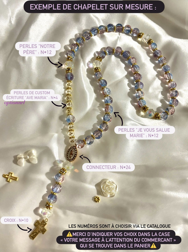 Vous pouvez crรฉer votre propre chapelet avec les รฉlรฉments de votre choix. Pour cela, il vous suffit dโรฉcrire dans la case ยซ Votre message ร lโattention du commerรงant ยป, visible dans votre panier, un message comme celui-ci :