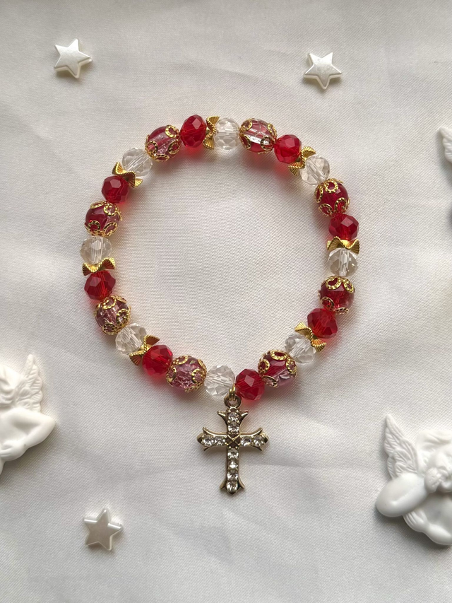 Magdalena (Marie-Madeleine) est une figure centrale du Nouveau Testament. Témoin de la crucifixion de Jésus, elle fut la première à le voir ressuscité, marquant ainsi sa transformation spirituelle (Jean 20:14-18). Le rouge de ce bracelet reflète son amour inébranlable pour Jésus et sa quête de rédemption (Luc 7:47). Le doré évoque la lumière divine qu’elle a rencontrée lors de la résurrection (Matthieu 28:9).