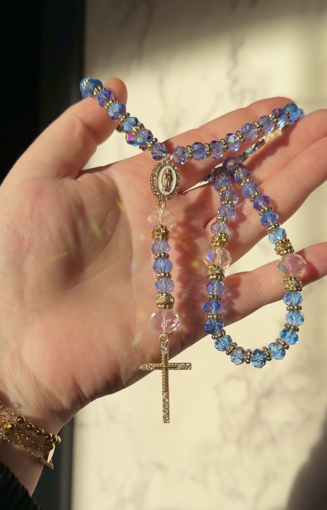Esaïe, prophète majeur de l’Ancien Testament, est associé à ces teintes. Le bleu clair reflète la vision apaisante et divine qu’il a reçue, notamment ses prophéties de paix et d’espérance pour le peuple d’Israël (Ésaïe 9:6). Le doré symbolise la pureté et la lumière des messages prophétiques qu’il a transmis, annonçant la venue du Messie (Ésaïe 11:1-2). Ce chapelet nous invite à méditer sur les promesses de Dieu comme l’a fait le prophète Esaïe.