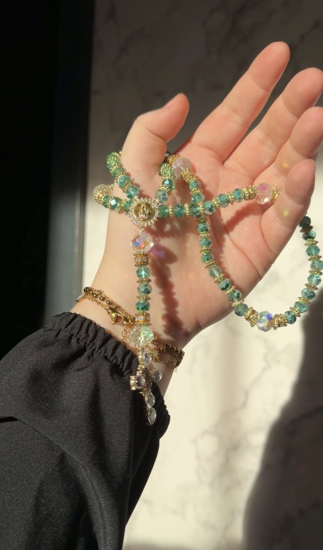 Le vert holographique du chapelet symbolise la vie nouvelle, la renaissance et la lumière divine qui transforme même les moments les plus sombres. Le reflet irisé évoque la mer, les vagues et la présence mystérieuse de Dieu dans l’épreuve. La croix montée à la main, ornée d’ailes d’ange, représente la protection céleste et la guidance divine, tandis que le cœur au centre rappelle l’amour infini de Dieu, capable de changer les cœurs.