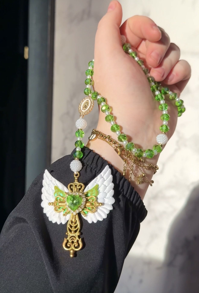Les perles vertes et blanches de ce chapelet rappellent la fraรฎcheur et la vitalitรฉ de sa foi. Le vert est le signe de lโ€™espรฉrance, comme celle quโ€™elle a vรฉcue en attendant lโ€™accomplissement des promesses de Dieu. Le blanc des ailes exprime la puretรฉ de son cล“ur immaculรฉ. La croix montรฉe ร  la main symbolise lโ€™humilitรฉ de sa vie cachรฉe ร  Nazareth, oรน elle a grandi dans une foi simple et fรฉconde.