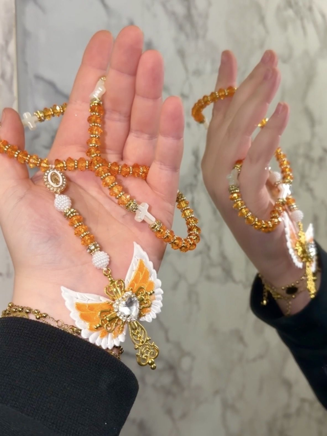 La couleur orange du chapelet symbolise la lumiรจre, la chaleur et la joie spirituelle, rappelant lโamour vivant et rayonnant de Marie pour lโhumanitรฉ. La croix, montรฉe entiรจrement ร la main, est ornรฉe dโailes dโange, signes de protection cรฉleste et de prรฉsence divine, tandis que le cลur placรฉ en son centre รฉvoque lโamour maternel et la misรฉricorde. Ce chapelet invite ร une priรจre emplie de confiance sous la protection aimante de la Vierge Marie.