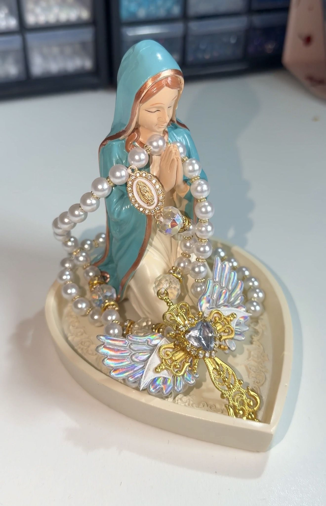 Les perles blanches nacrรฉs de ce chapelet expriment la douceur et la tendresse de son cล“ur maternel. Lโ€™holographique rappelle la joie de Bethlรฉem, oรน les anges ont chantรฉ la paix pour tous les hommes. Les ailes dรฉlicates et la croix montรฉe ร  la main soulignent la beautรฉ simple de sa mission : porter lโ€™amour du Christ au monde, avec la tendresse dโ€™une mรจre qui nโ€™abandonne jamais ses enfants.