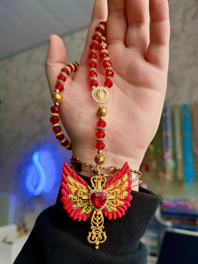 Les ailes rouges et les perles écarlates de ce chapelet évoquent l’amour brûlant de Marie pour son Seigneur et pour ses enfants. Le rouge rappelle sa présence au pied de la Croix, où son cœur fut transpercé par l’épée annoncée par Syméon (Luc 2:35). La croix montée à la main témoigne de la force de sa foi, une foi qui ne s’éteint pas dans l’épreuve mais devient lumière et espérance.
