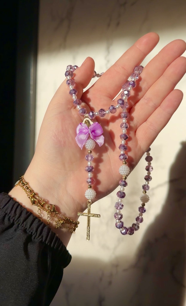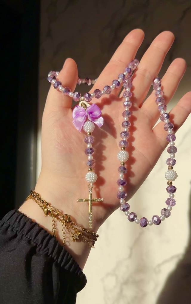 Les reflets lila brillants de ce chapelet rappellent cette dimension de l’histoire de Sarah. Comme la couleur lila, douce mais lumineuse, ils symbolisent l’espérance qui traverse les moments de doute et d’attente. Chaque scintillement évoque la promesse de la vie nouvelle et la révélation de la grâce divine, rappelant que même dans les périodes d’incertitude, la lumière de Dieu guide et éclaire le chemin.