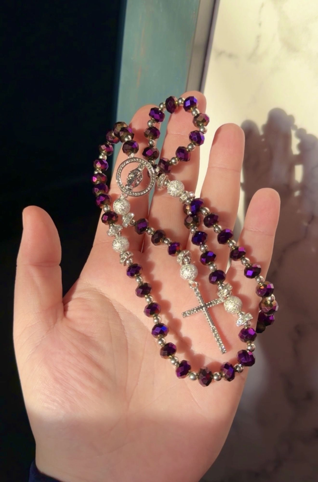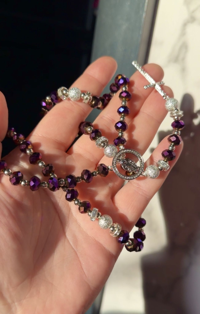 Le violet brillant de ce chapelet évoque la royauté, la sagesse et la profondeur spirituelle, l’argenté symbolise la lumière divine, la gloire et la présence de Dieu, et les perles argentées brillantes rappellent l’espérance, la pureté et la guidance céleste.