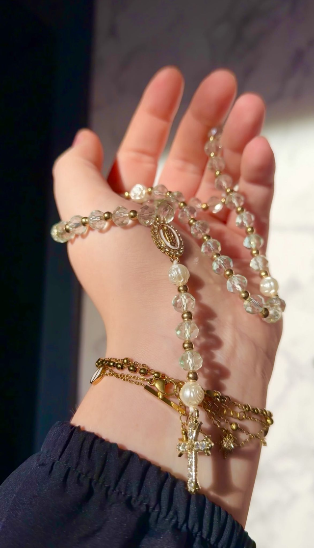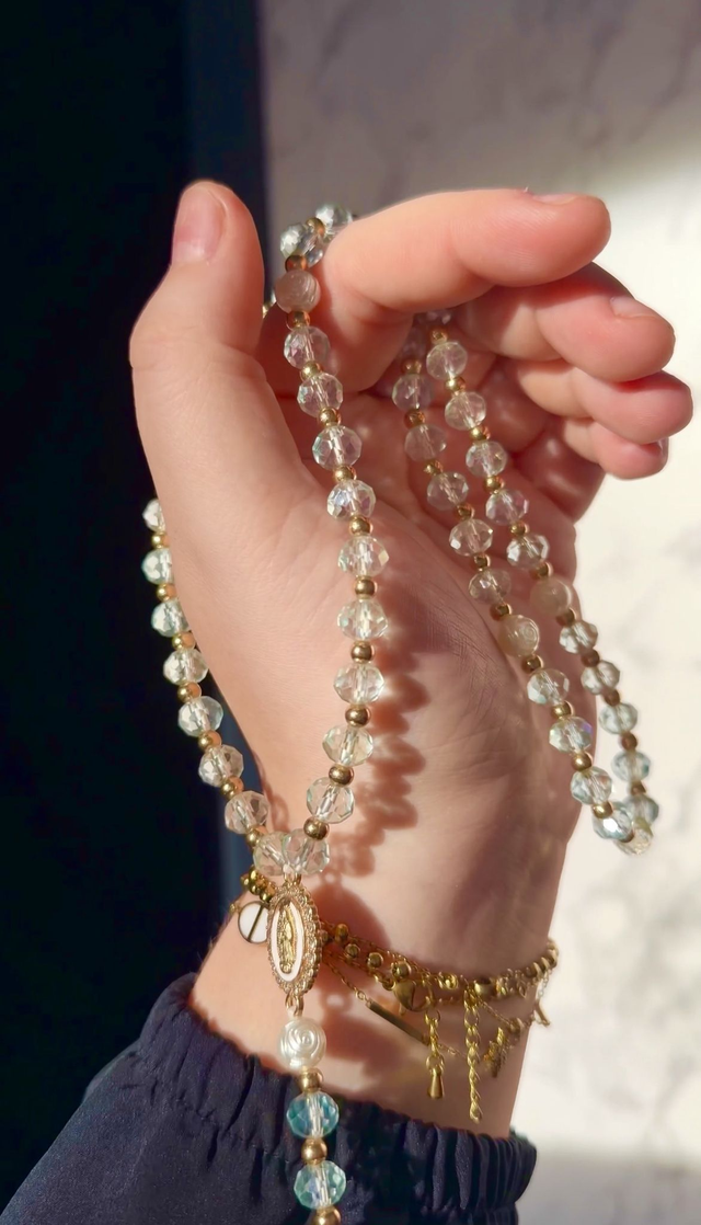 Le vert d’eau clair et transparent évoque l’eau vive, la guérison et la renaissance, rappelant l’épisode où Tobias utilise le poisson du fleuve pour apporter la guérison, selon l’instruction divine. Cette couleur symbolise également la douceur, la paix et l’espérance qui accompagnent son voyage. Le doré représente la lumière de Dieu et la présence de l’ange Raphaël, guide céleste envoyé pour protéger et éclairer son chemin.