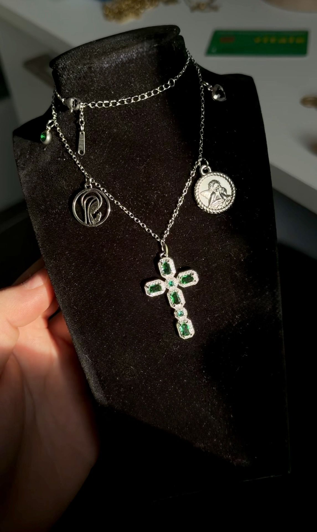 Ce collier, argenté et vert, avec sa croix et ses charms, reflète cette dualité de force et de lumière. Le vert symbolise l’espérance et la vie, tandis que l’argenté apporte pureté et clarté. Un bijou spirituel qui invite à la sérénité, au courage et à la confiance dans la guidance divine.