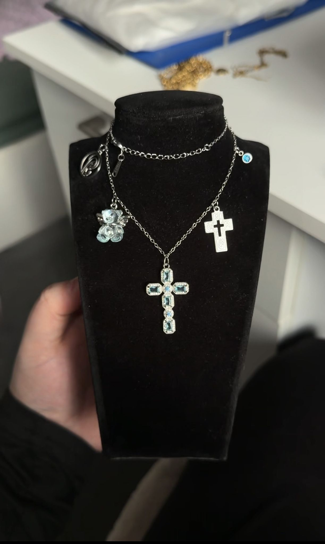 Ce collier, argenté et bleu, avec sa croix et ses charms, reflète cette foi vivante. Le bleu évoque la sérénité, la protection et l’espérance, tandis que l’argenté apporte pureté et lumière. Un bijou spirituel qui invite à la paix intérieure, à la confiance et au courage dans le chemin de la vie.
